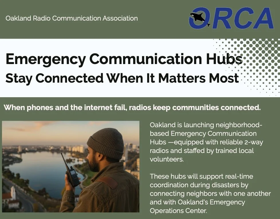 Beginning in early 2025, the Oakland Radio Communication Association (ORCA), in close partnership with Oakland’s Emergency Management Services Division (EMSD), Oakland Firesafe Council’s GENOAK network, and community organizations across the City, developed and implemented Oakland’s first pilot Emergency Communication Hub (ECH) program.